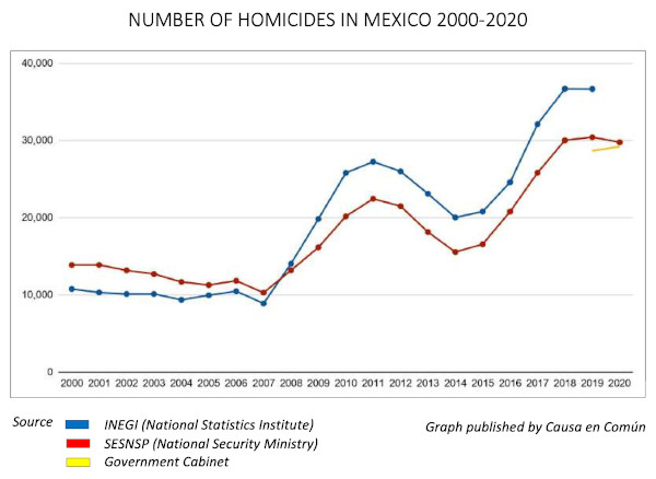 President López Obrador assumed power at the end of 2018 with the promise of pacifying the country and blaming the former presidents for the insecurity issues the country was facing. However, he recognised challenges when containing homicides, witnessing a record during his first year of presidency in 2019 with 34.600 homicides. In the following years, the number of homicides slightly decreased but still remains in a very high level.