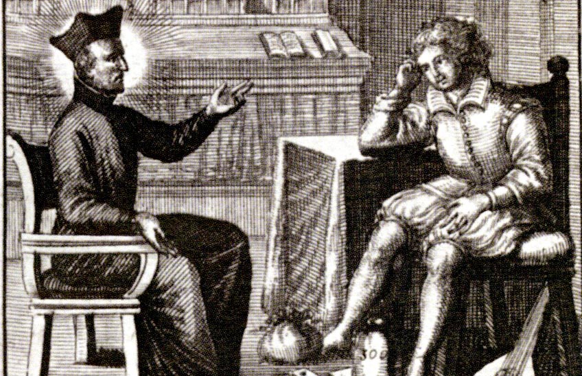 El tema de la vanidad del mundo fue uno de los preferidos del Barroco. Para aludir a las misma siempre se acudía a joyas, armas, relojes, juegos, escudos nobiliarios, armas y libros que hablaban de todo lo perecedero. En caso de Javier y su conversación con san Ignacio, cuando éste le esgrimió el argumento sobre ganar el mundo y perder la eternidad, se avenía perfectamente con el tema de lo perentorio de las cosas terrenas. De hecho, los elementos que aparecen en el grabado de Friedrich ya se habían utilizado en otras estampas relativas a Javier, según se desprende de los trabajos y la tesis doctoral de Gabriela Torres. Nos detendremos en la que figura en la Vita S. Francisci Xaverii Soc. Iesu Thestibus Philosophicis illustrata (Viena, 1690), editada y estudiada por la referida investigadora, con numerosos grabados inspirados en las vidas ya conocidas del santo. En una de sus ilustraciones encontramos a san Ignacio hablando al joven Javier, vestido con rico atuendo. A sus pies aparecen un violín, otro instrumento de cuerda, una partitura, una corona alusiva a las glorias mundanas, una corneta referida a la fama, así como unas talegas con dinero y una baraja. Al fondo una gran mesa de estudio con numerosos libros, una esfera del mundo y un cuadro con la imagen de la Virgen con el Niño. A la postre, los mismos elementos que en la estampa de Friedrich que ilustra la obra del jesuita André Eschenbrender.