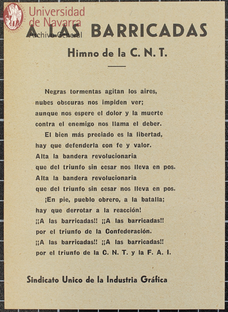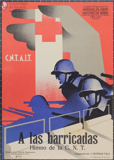 "A las Barricadas" (Himno de la C.N.T.). (Adaptación de J. Dotras Vila). Comisión Organizadora Hospitales de Sangre y Guarderías de Niños del Sindicato Único Regional de Peritos y Técnicos Industriales C.N.T.-A.I.T. de Valencia