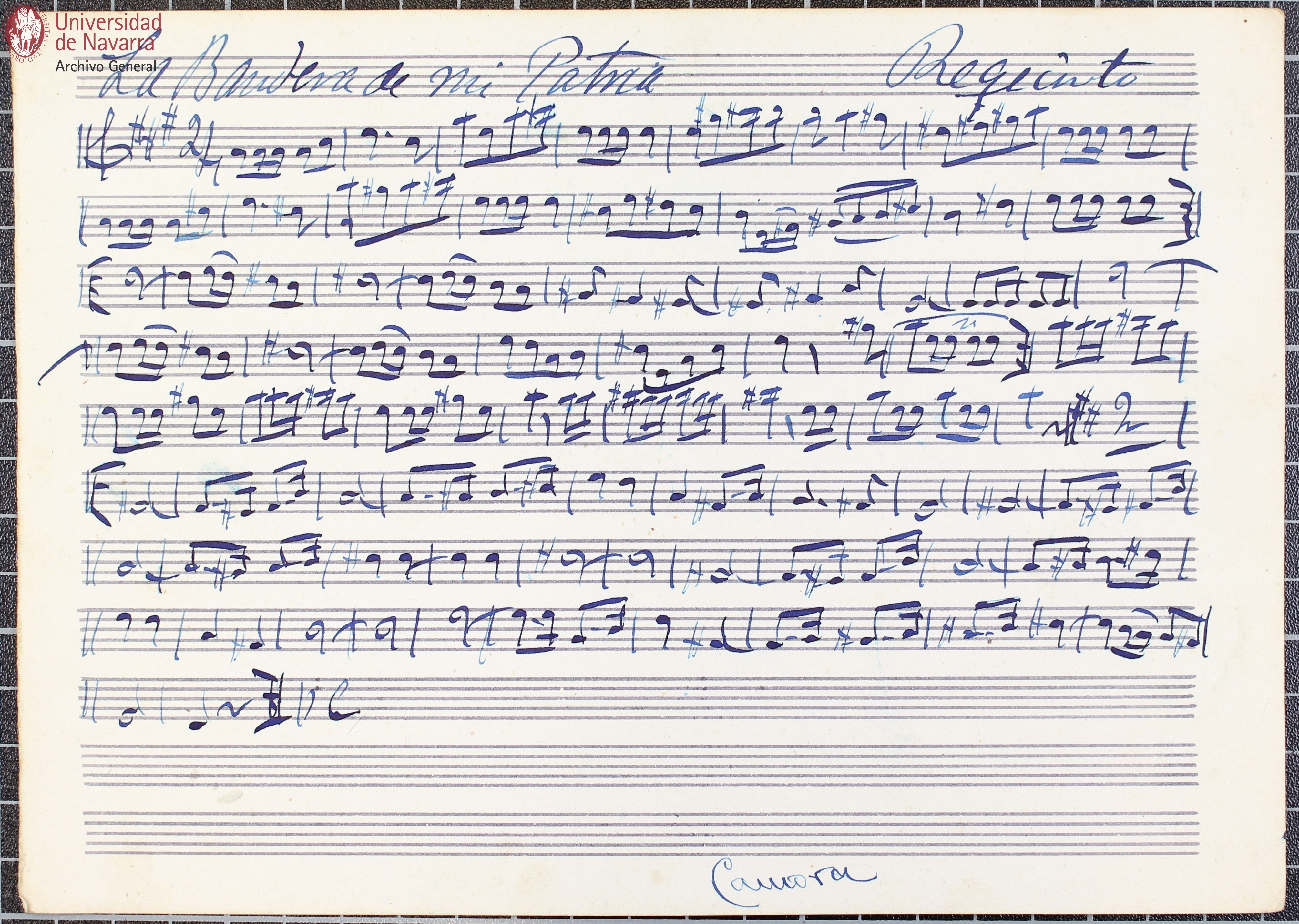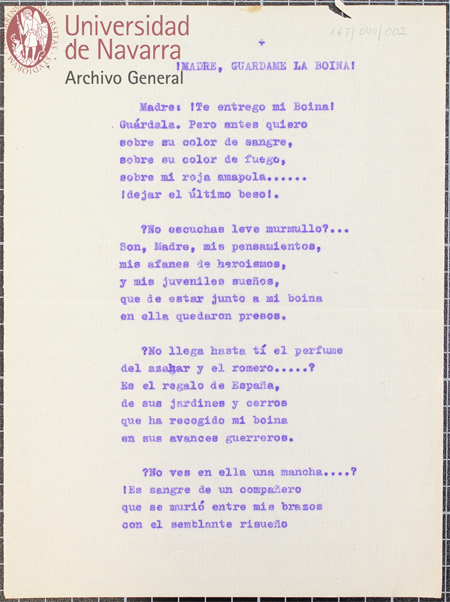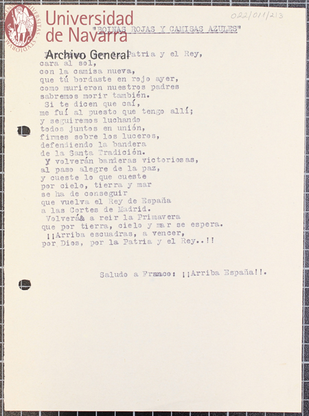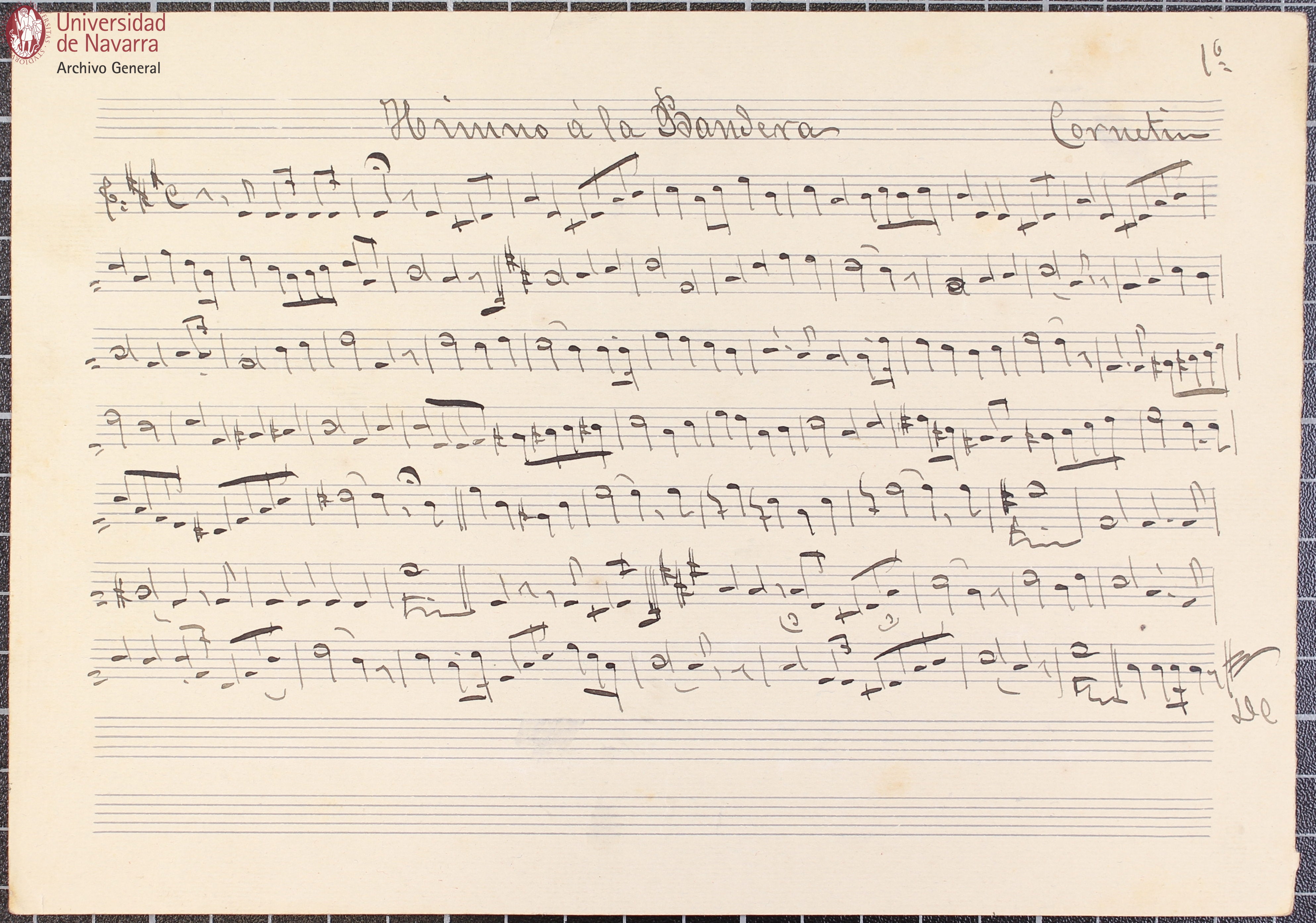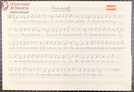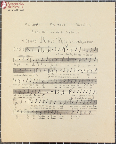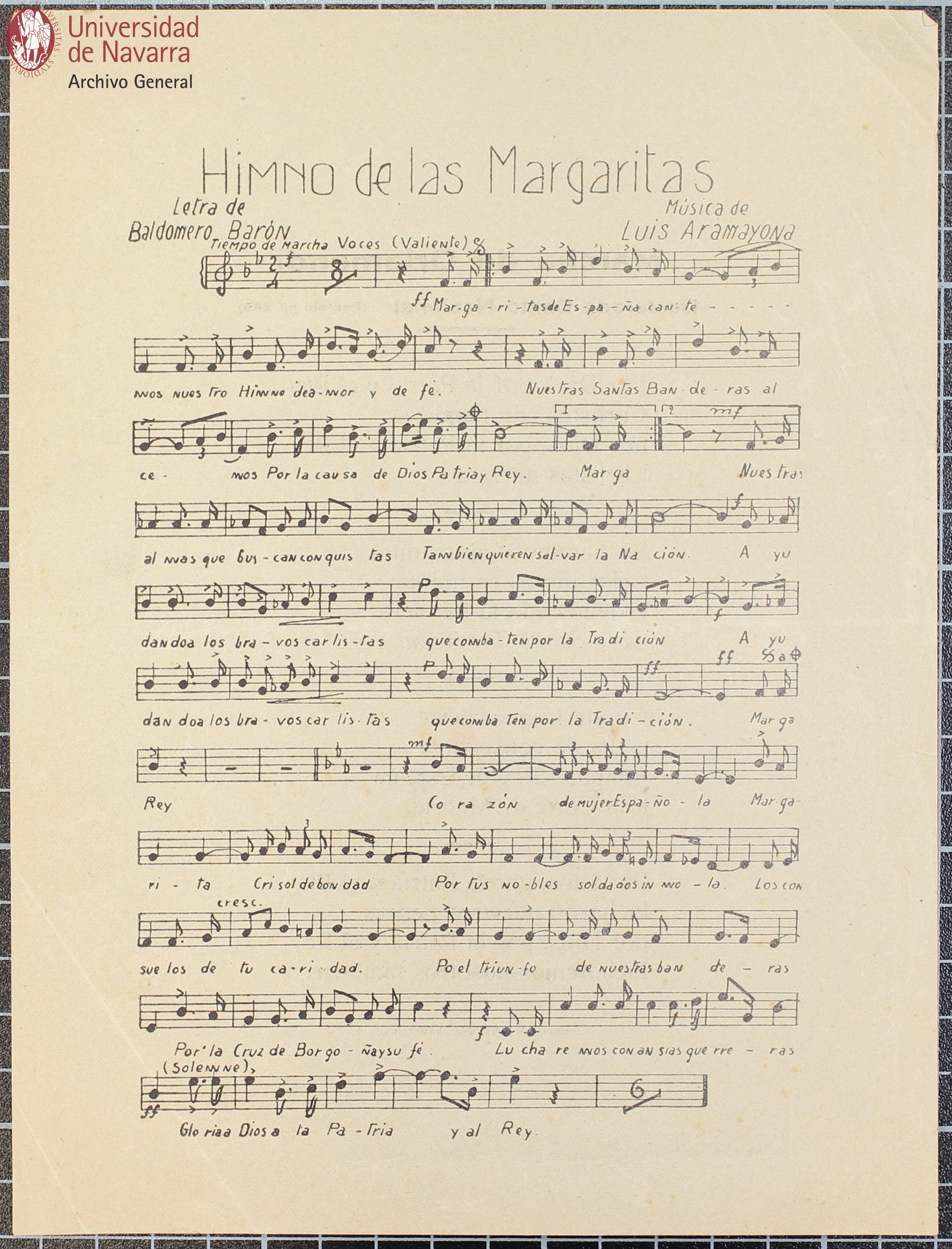 Partitura "Himno de las Margaritas". (Música de Luis Aramayona, letra de Baldomero Barón). En el verso: letra de la "Marcha de Oriamendi"
