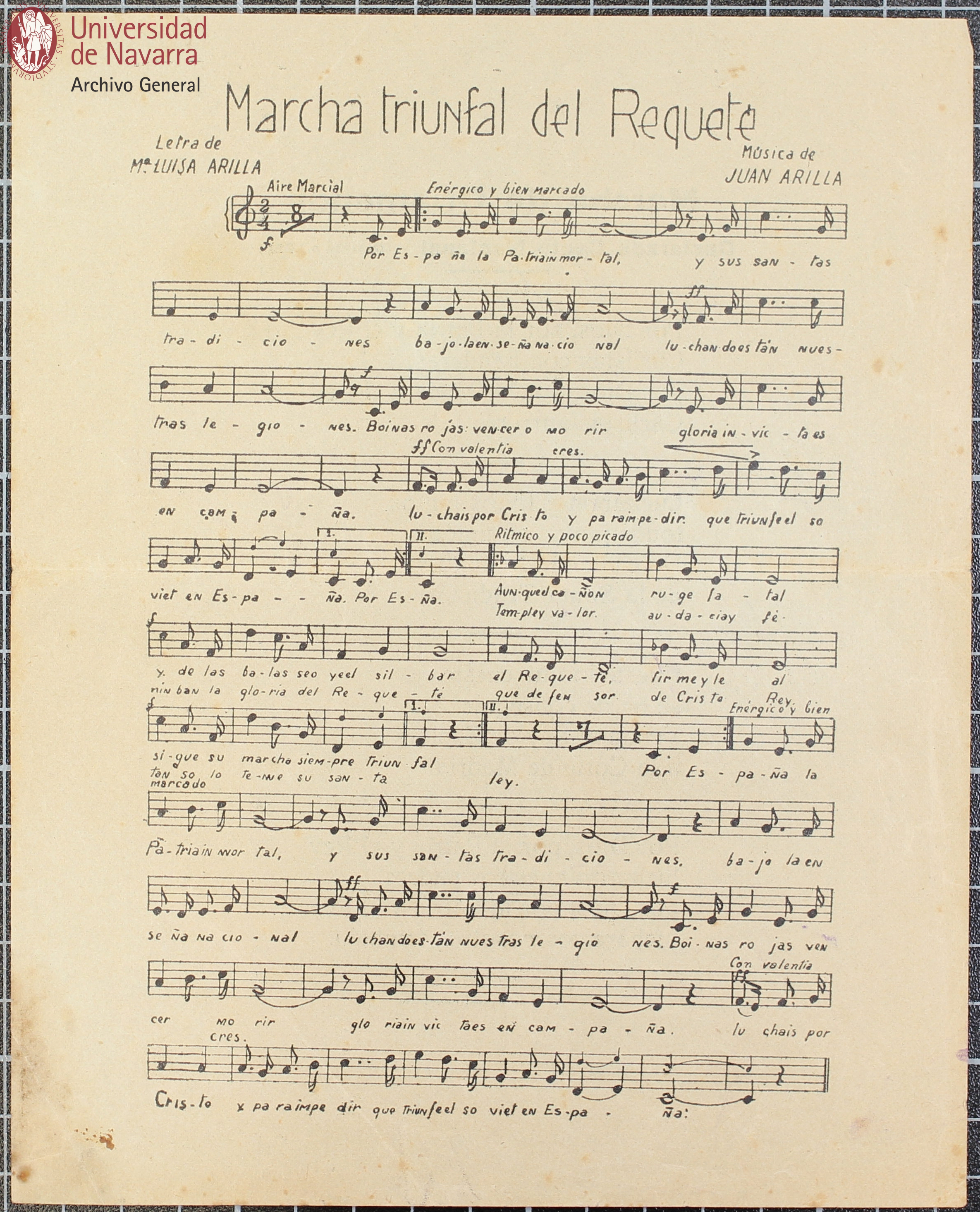 Partitura "Marcha triunfal del Requeté". (Música de Juan Arilla, letra de Mª Luisa Arilla). En el verso: letra de la "Marcha de Oriamendi"