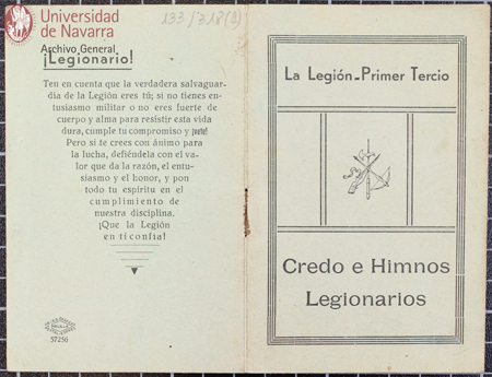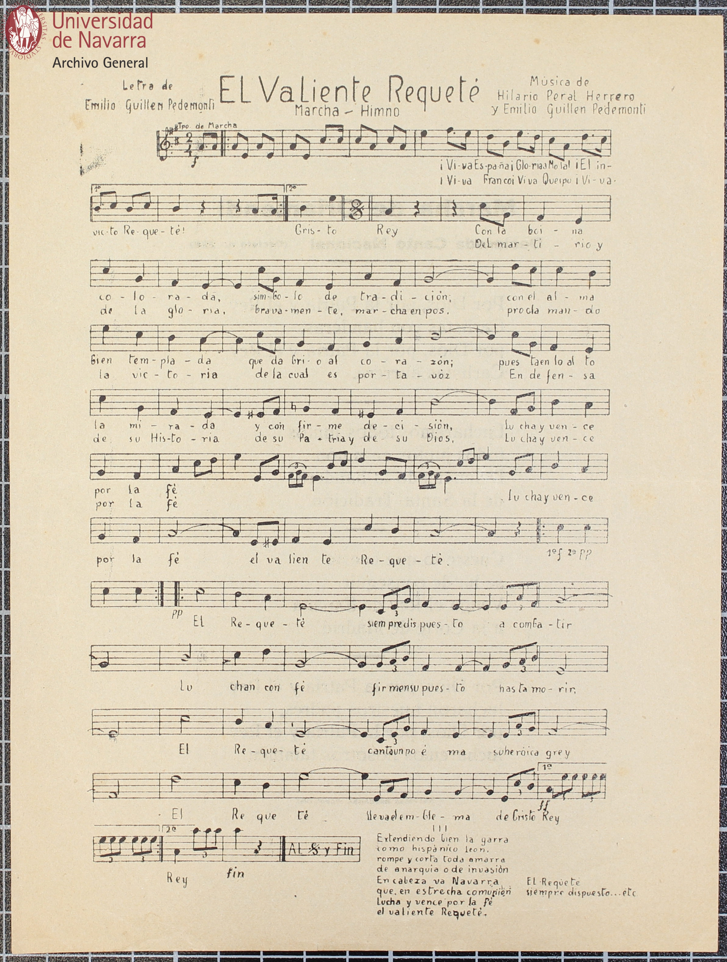 Partitura "El Valiente Requeté". (Música de Hilario Peral Guerrero y Emilio Guillén Pedemonti, letra de Emilio Guillén Pedemonti). En el verso: letra de la "Marcha de Oriamendi"