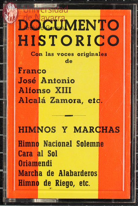 Casete de audio "Documento Histórico". Con las voces originales de Franco, José Antonio, Alfonso XIII, Alcalá Zamora, etc. Himno Nacional Solemne, Cara al Sol, Oriamendi, Marcha de Alabarderos, Himno de Riego, etc.