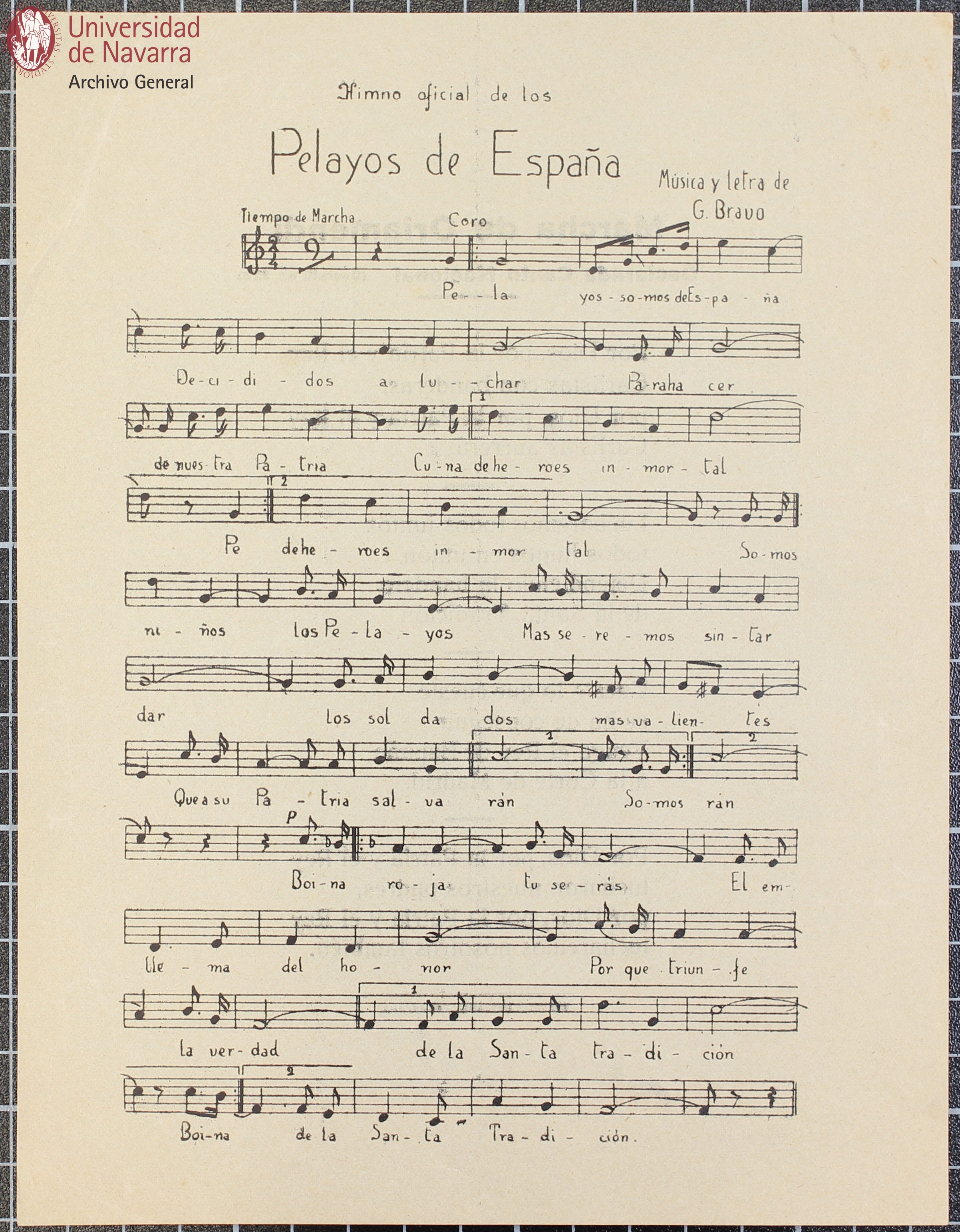Partitura "Himno Oficial de los Pelayos de España". (Música y letra de G. Bravo).En el verso: letra de la "Marcha de Oriamendi"