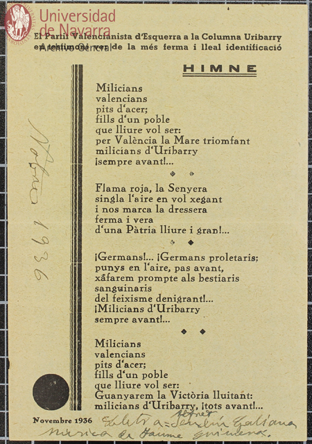 Letra de "Himne" (El Partit Valencianista d´Esquerra a la Columna Uribarry en testimoni ver de la més ferma i lleal identificació)