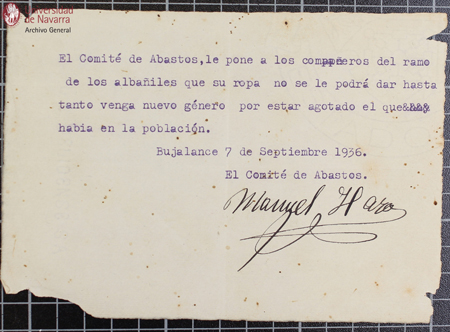 Título Nota de Manuel Haro del Comité de Abastos de Bujalance (Córdoba) en la que avisa a los albañiles de que no se les puede proporcionar su ropa hasta que no venga nuevo género al haberse agotado el que había en la población