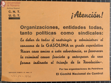 Título Pasquín del Comité Nacional de Control, C.N.T., U.G.T., en el que se pide a todas las organizaciones y entidades que restrinjan y administren el consumo de gasolina