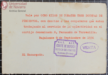 Título Vale por ocho kilos de tomates y tres docenas de pimientos para los miembros de la C.N.T., A.I.T. que están trabajando al servicio de la colectividad en el cortijo S. Fernando de Torresilla, Bujalance (Córdoba)
