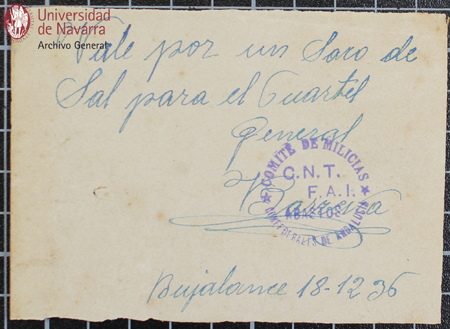 Título "Vale por un saco de sal para el Cuartel General". Comité de Milicias, Confederales de Andalucía, C.N.T., A.I.T.de Bujalance (Córdoba)