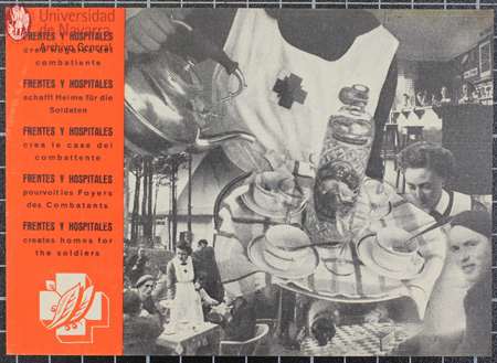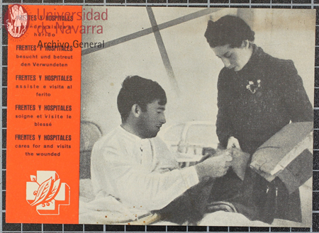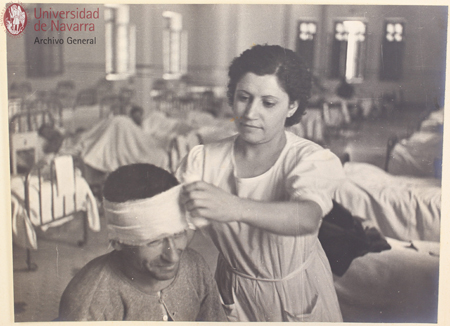 Fotografía de una mujer vendando la cabeza de un herido. Al fondo se ven numerosas camas con más heridos. Forma parte del álbum que los fotógrafos "Minuteros" de Madrid dedicaron a J. Stalin y al pueblo Ruso en su XX aniversario