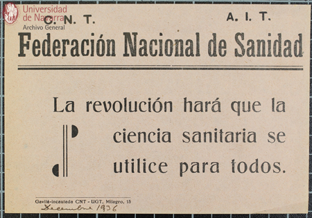 Pasquín titulado "La revolución hará que la ciencia sanitaria se utilice para todos", Federación Nacional de Sanidad, C.N.T, A.I.T.