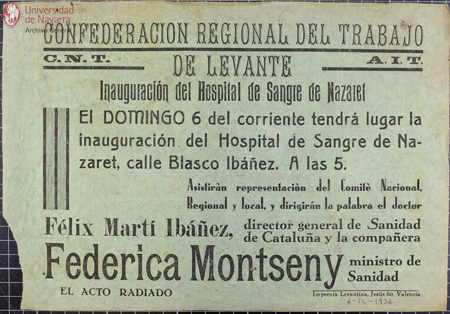 Pasquín que anuncia la inauguración del Hospital de Sangre de Nazaret (Valencia) el domingo 6 de diciembre. Pronunciarán discursos Félix Martí Ibáñez, director general de Sanidad de Cataluña, y Federica Montseny, Ministra de Sanidad
