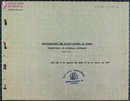 "Representación del Estado Español en Lisboa. Suministros de material sanitario", del día 3 de agosto de 1936 al 12 de enero de 1937