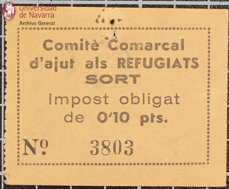 Impuesto obligatorio de 0,10 pesetas del Comitè Comarcal d´ajut als Refugiats Sort (Lleida)