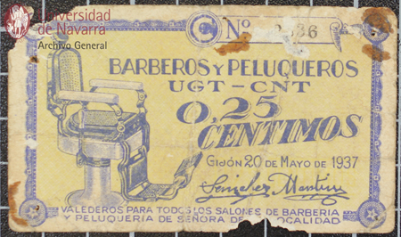 Vale por 0,25 céntimos de Barberos y Peluqueros U.G.T.-C.N.T. de Gijón valederos para todos los salones de barbería y peluquería de señora de la localidad