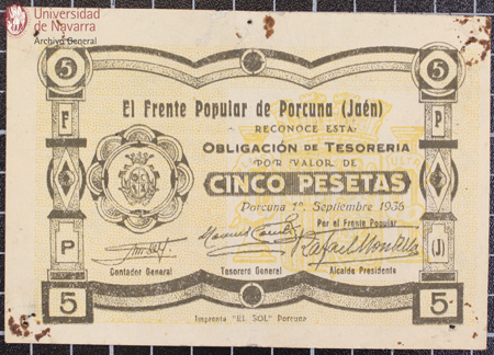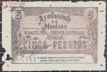 Billete de 5 pesetas del Comité del Frente Popular Inicial, Ayuntamiento de Montoro (Córdoba). De admisión obligatoria para transacciones de productos, jornales y demás pagos dentro de ese término