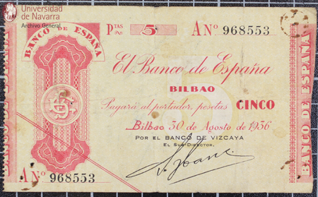 Billete -cheque- de pago al portador de 5 pesetas emitido por el Banco de España (Bilbao)