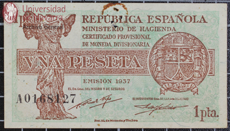 Billete de 1 peseta de la República Española. Certificado provisional de moneda divisionaria