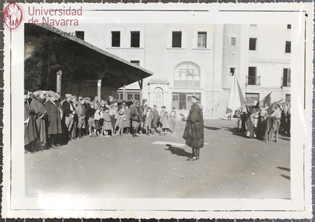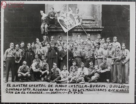 Fotografía "El Ilustre locutor de Radio Castilla-Burgos, D. Julio Gonzalo Soto, rodeado de algunos de los milicianos que se hallaban en el Cuartel. Santiago, 6-1-37"