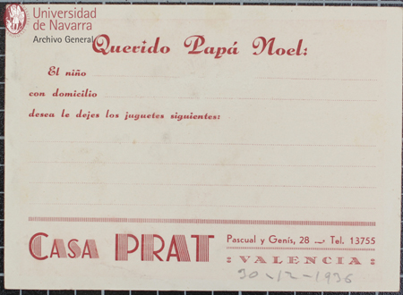 Tarjeta postal "Querido Papá Noel" para que los niños puedan pedir sus regalos. Casa Prat, Valencia