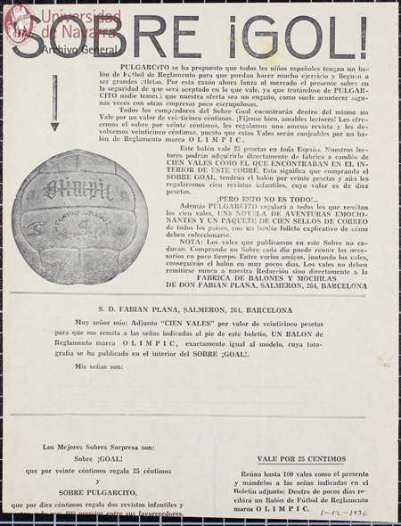 "Sobre ¡gol!". Publicidad para adquirir un balón de reglamento mediante vales