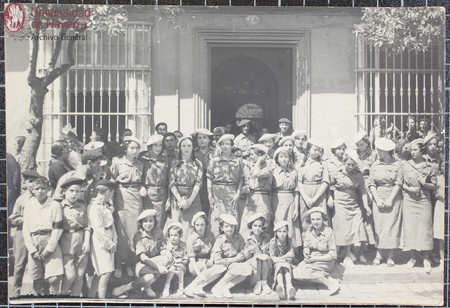 Fotografía de Margaritas y Pelayos en la puerta del cuartel del Tercio de la Merced en la recepción de la Banda del Requeté de Navarra en 1936
