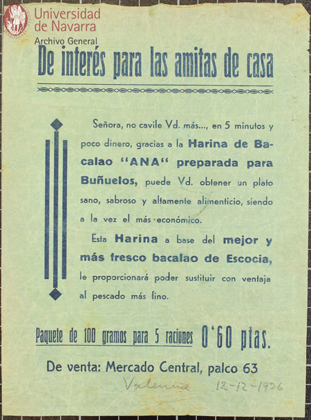 "De interés para las amitas de casa". Publicidad de la Harina de Bacalao "Ana", de venta en el Mercado Central de Valencia, Palco 63