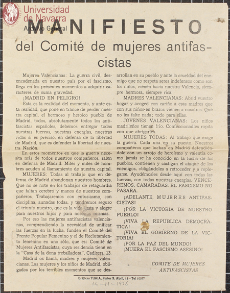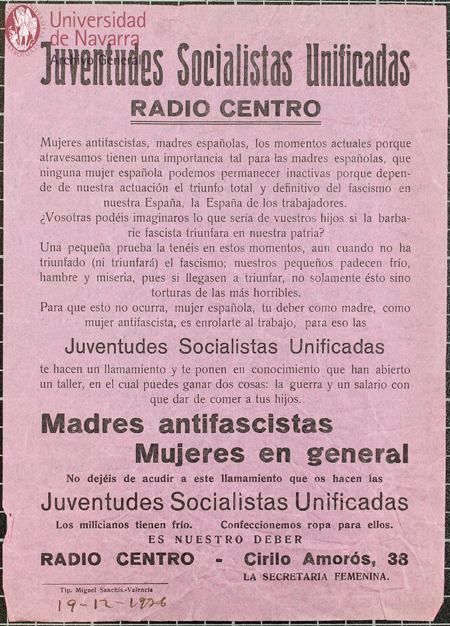 Pasquín titulado "Juventudes Socialistas Unificadas. Radio Centro". Llamamiento a las mujeres antifascistas para que vayan a trabajar a un taller, que han abierto las Juventudes Socialistas Unificadas, para confeccionar ropa para los milicianos