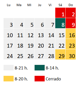 El horario en noviembre es de lunes a sábado de 8 a 21 h, a excepción de los siguientes días: