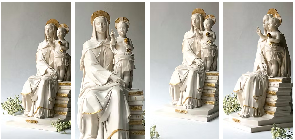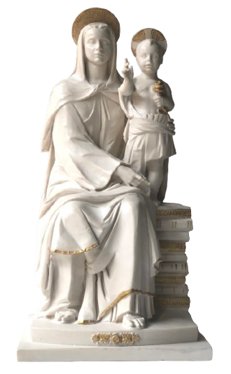 Según la nota autógrafa de San Josemaría para el encargo de la Virgen al escultor Sciancalepore... "de tamaño natural, más bien alta; sentada y sosteniendo al Niño Jesús, que estará de pie sobre un rimero de libros; se verán, al menos, los lomos de tres de esos libros: el más bajo, en el que se leerá el título: Derecho Civil; en otro, se leerá Medicina; y, en el más alto, Ius Canonicum; el Niño tendrá una rosa, en la mano izquierda, apretada contra su pecho; y, con la mano derecha, bendecirá.