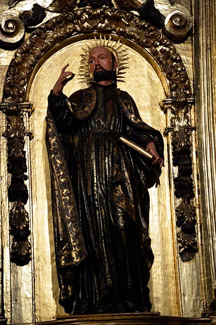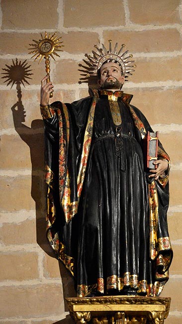 Realizada en madera dorada y policromada, la escultura destaca precisamente por su rica policromía que, frente a la anterior imagen, aquí invade la totalidad de la sotana y manteo con elementos vegetales, roleos y el emblema de la Compañía. Desde el punto de vista iconográfico nos encontramos ante una imagen prácticamente idéntica a la anterior. El santo, erguido, con una rodilla ligeramente flexionada, vestido de sotana y manteo, sosteniendo con una mano un sol eucarístico hoy desaparecido y con la otra el libro de las constituciones. El rostro se ajusta a las características de la vera effigies.