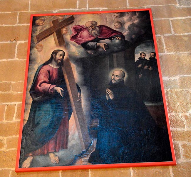 Pues bien, este lienzo representa uno de los episodios de la vida de san Ignacio, concretamente aquel en el que el santo camino de Roma en 1537, al entrar en una iglesia tuvo una visión de Cristo quien, con la cruz a cuestas y en compañía de Dios Padre, prometió al santo serle propicio en Roma: Ego sum Romae propitius ero. El cuadro reproduce de manera bastante literal el texto en el que Ribadeneyra narra el episodio. Ignacio se encuentra solo en una iglesia, esperándole en el exterior dos personas que identificamos con los padres Pedro Fabro y Diego Lainez. Se le aparece Cristo con la cruz a cuestas y, como dice el texto, Dios Padre se vuelve a Jesús y señala a Ignacio reproduciendo con el gesto de la mano lo que dice el texto de que “le encomendaba a él y a sus compañeros y los entregaba a su poderosa diestra”.