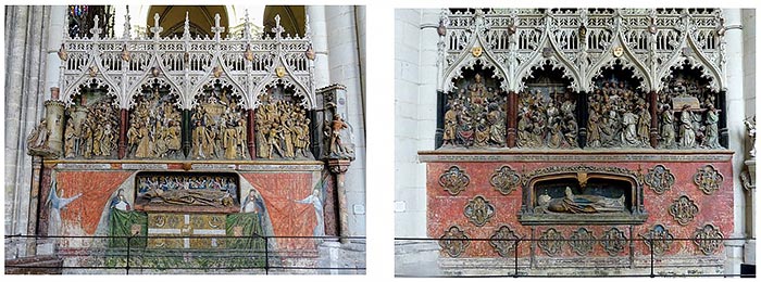 Pero volvamos a Amiens para acompañar a san Fermín en la última etapa de su vida terrenal. La ciudad cuenta con un abundante repertorio figurativo que permite la contemplación visual de los episodios que compendian su hagiografía, siguiendo un relato cronológicamente secuenciado, recogido en narraciones escritas, de tradición culta o popular, entreveradas con ingenuas leyendas. Concretamente me refiero a su Catedral (1220-1288), en cuyo trascoro, cerrado por muro a la nave sur, en sendos intercolumnios y sobre los arcosolios que cobijan las figuras yacentes del obispo Ferry de Beauvoir († 1472) y de su sobrino, el deán Adrien Hénencourt († 1530), se encuentran ocho escenas: respectivamente, cuatro referentes a la vida del mártir; y otras cuatro, de asuntos post mortem... Los episodios se limitan por enmarques cuadrangulares de columnillas, rematados por arcos conopiales, festoneados de caireles lobulados. El resultado del conjunto resulta unitario: los primeros estaban realizados para 1490; y la escultura de los segundos –a excepción de la figura del yacente y labores de pintura–, contratada en 1527, estaba ultimada para 1530. Unos y otros fueron encargo del deán Hénencourt. La escultura, magníficamente policromada y dorada, oscila entre el alto relieve y el bulto redondo. Los fondos, pictóricos, representan paisajes exteriores o ámbitos interiores, según el caso. El anacronismo de tipos e indumentos aproxima emocionalmente unos acontecimientos de época romana a la percepción cristiana de entorno al 1500.