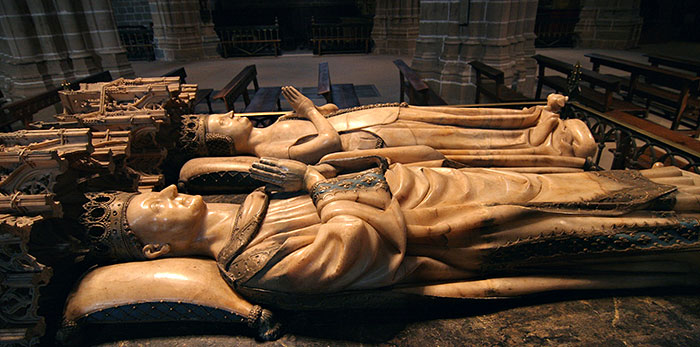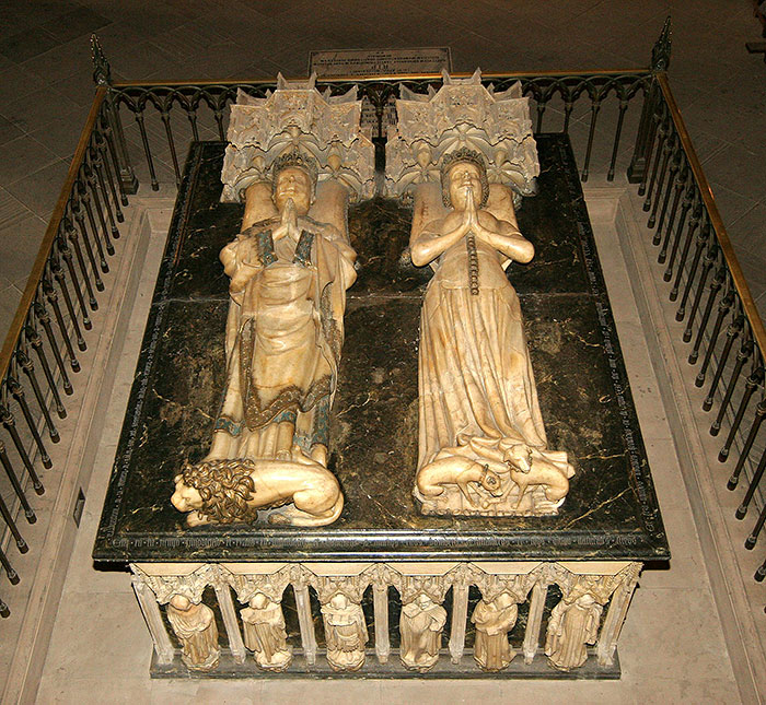 Por otro, la tumba de Carlos V de Francia y su esposa Juana de Borbón (1364-1376), debida a André Beauneveu y Jean de Lieja, con la que concuerda en su condición de sepultura doble, en la indumentaria de los yacentes y en el recurso para estos de doseles arquitectónicos.