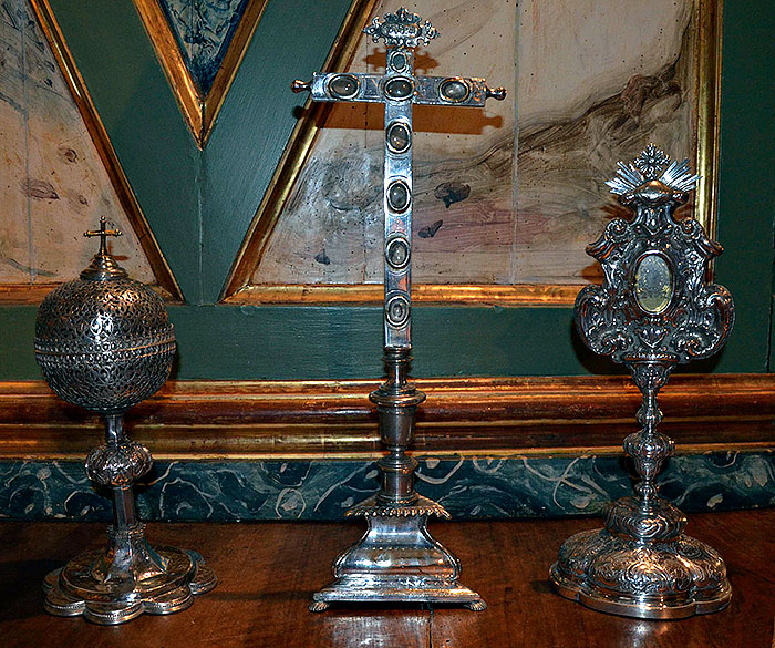 Relicario de San Fermín, cruz de reliquias y relicario de San Pablo, empleados junto con el relicario de San Esteban en las procesiones claustrales de primera clase. Foto: Alejandro Aranda.