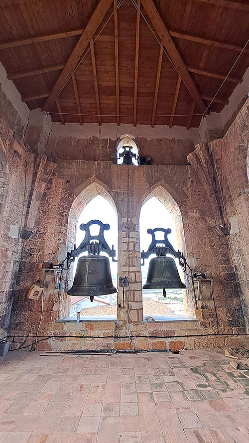Vista de las campanas de San Román de Cirauqui desde el interior de la torre. La mayor, situada a la izquierda, es la bendecida el 2 de marzo de 1924.