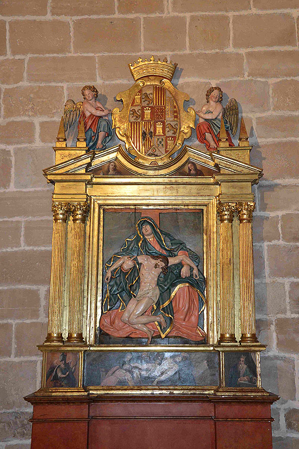 Finalmente, hay motivos iconográficos que pueden relacionarse con la función del retablo, como el de la Piedad, que tenía como fin acoger la celebración de misas en sufragio de los reyes; de ahí las alusiones a la muerte (Piedad, Entierro de Cristo y san Miguel, encargado de pesar las almas) y a la Monarquía (san Luis de Francia y el escudo de armas reales).