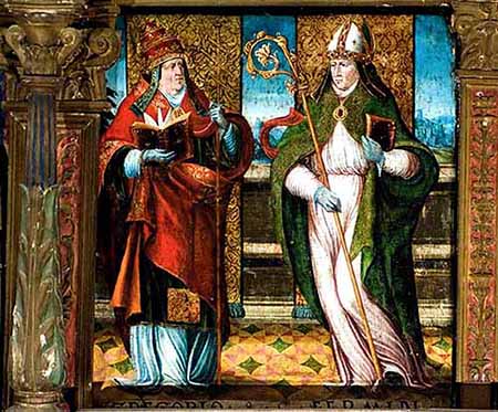 1.- San Fermín y San Gregorio en una tabla pintada por Juan del Bosque (1540-46) del retablo de Burlada, hoy en el Museo de Navarra