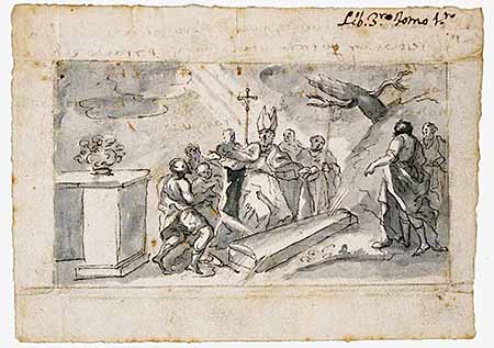 5.- Dibujo del hallazgo del cuerpo de San Fermín de José Lamarca para grabar la lámina correspondiente en la edición ilustrada de los Anales de Navarra, del P. Moret, 1766