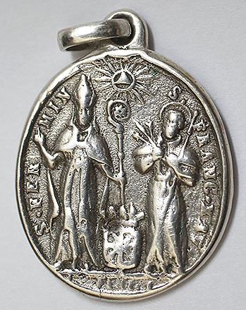 6.- Reverso de la medalla de la Virgen de Ujué con los copatronos de Navarra que sigue modelos romanos. Fines del siglo XVIII