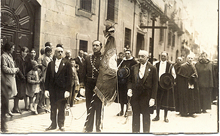La bandera de la ciudad es portada por el concejal D. Enrique Ansaldo Bejarano, luciendo uniforme de Gentilhombre de S.M. el Rey. Las borlas fueron portadas por D. Javier Ciga y D. Ignacio Altuve. 1930. Galle/AMP