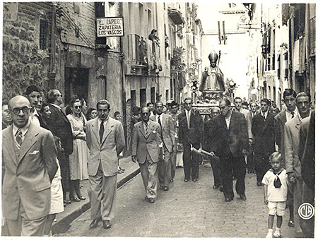 Fiesta del Martirio de San Fermín. La procesión en la calle Mañueta. 1948. Cía/AMP