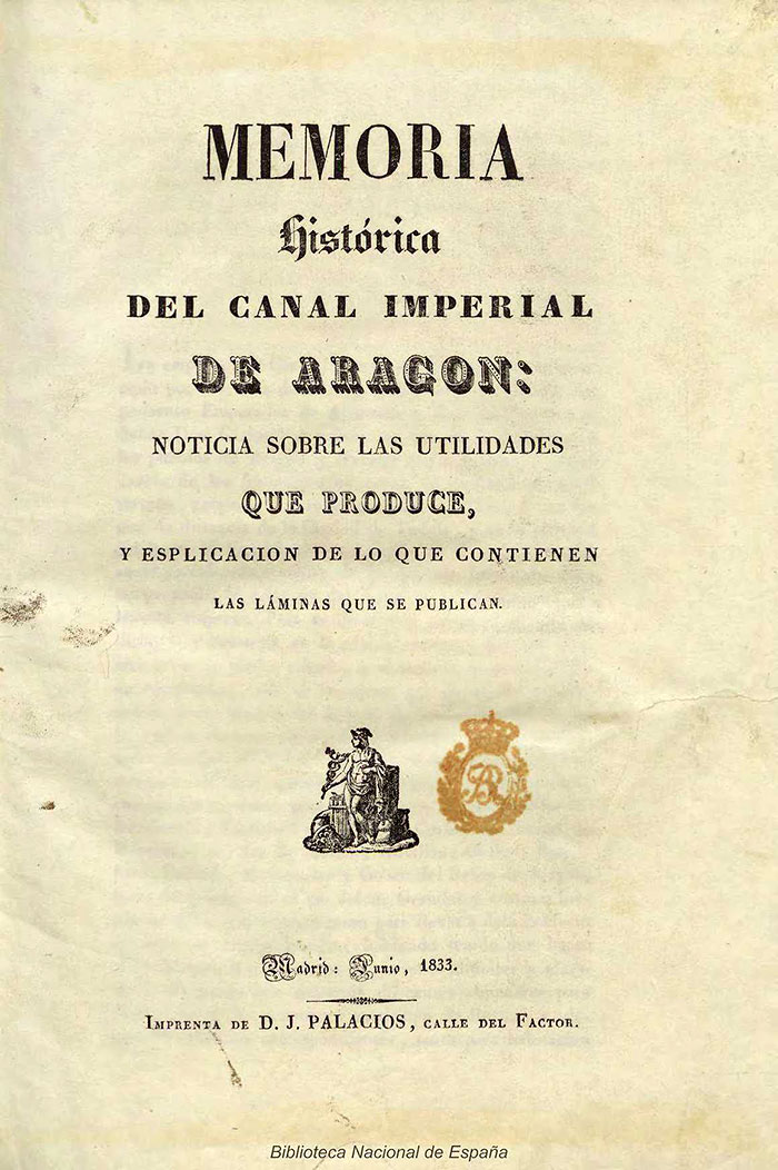 Portada de la obra Memoria Histórica del Canal de Aragón: Noticia de las utilidades que produce, y esplicación de lo que contienen las láminas que se publican. BNE.