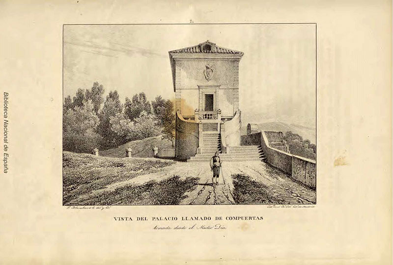 Lámina I. Vista del Palacio llamado de Compuertas, tomado desde el Medio Día. La vista del costado del Palacio nuevo, llamado de Compuertas, por debajo del cual entran las aguas del río Ebro en el Canal. Se presenta una magnífica escalinata para subir al dicho Palacio, cuya vista está tornada desde el mediodía, teniendo a su derecha al río Ebro y a su izquierda, la margen del Canal, toda cercada de grandes arboledas.