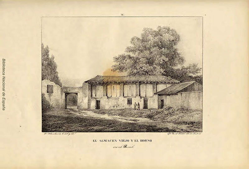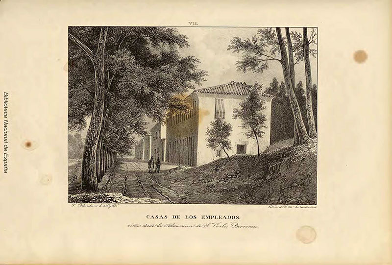 Lámina VII. Casas de los empleados, vistas desde la Almenara de San Carlos Borromeo. Vista de las casas de los Empleados que habitan en El Bocal, de la posada pública, y de los almacenes que hay en este recinto, tomada desde la almenara de San Carlos Borromeo.