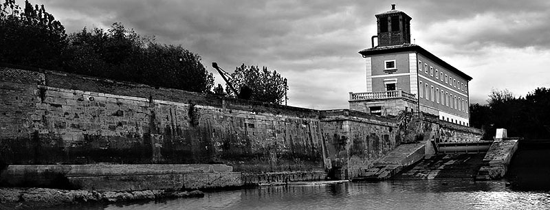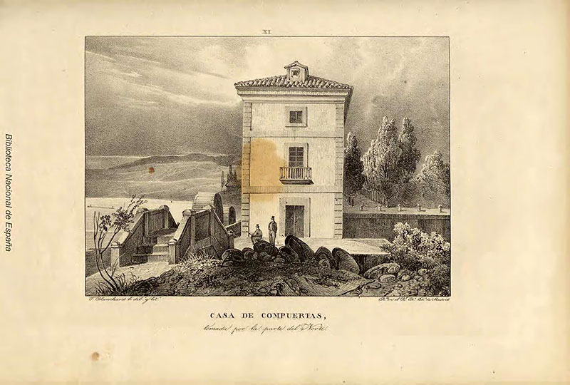 Lámina XI. Casa de Compuertas tomada por la parte del Norte. Vista del costado del Palacio nuevo de Compuertas, por la parte del Norte, opuesto al de la Lámina I. Al lado izquierdo se describe un arco de cantería, que forma un pequeño puente con su escalinata para el paso, debajo del cual está la Esclusa que tiene el Canal para su comunicación con el río. Más atrás se descubren las ruedas de la máquina que se usa para la limpia de la playa del río delante de las bocas del Canal.