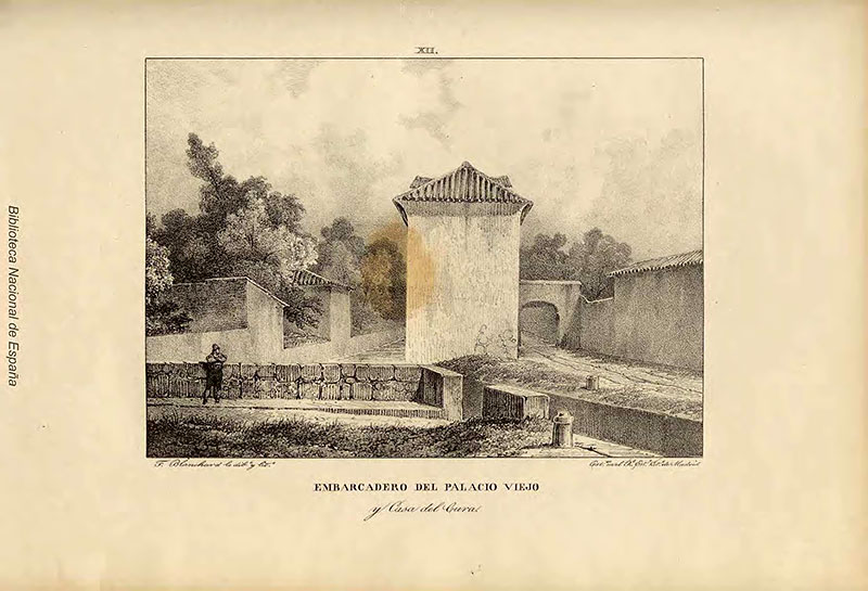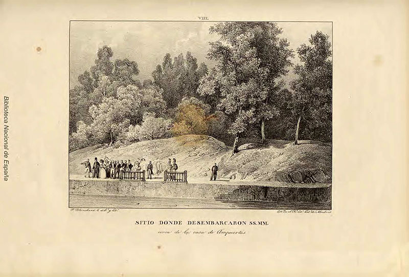 Lámina VIII. Sitio donde desembarcaron SS. MM. cerca de la Casa de Compuertas. Vista del desembarco de los Reyes Nuestros Señores Don Fernando y Doña María Josefa Amalia, en el mes de mayo de 1828, cuando pasaron a ver las obras de El Bocal, en el sitio contiguo al Palacio nuevo de Compuertas, el cual no se llega a descubrir en la lámina. Se trata del rey Fernando VII y María Josefa Amalia de Sajonia, hija del príncipe Maximiliano de Sajonia y la princesa Carolina de Borbón-Parma, tercera esposa de Fernando VII, que contrajeron matrimonio el 20 de octubre de 1819.