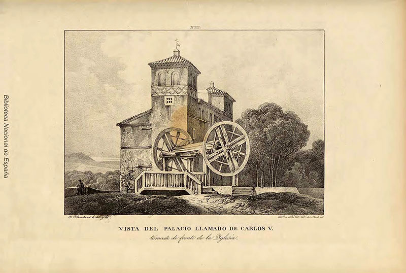 Lámina XIII. Vista del Palacio de Carlos V tomada de frente de la Iglesia. Vista por un costado del Palacio de Carlos V y del puente de madera para el paso del Canal. A su lado están las ruedas de las esclusas antiguas que hay en este Canal, según el uso de aquellos tiempos.