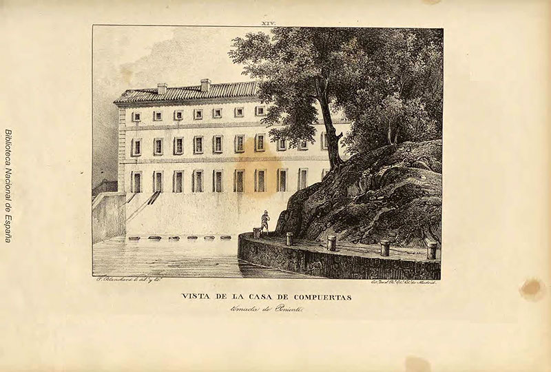 Lámina XIV. Vista de la Casa de Compuertas tomada de Poniente. Vista del Palacio nuevo de Compuertas, en el que se ven parte de las bocas por las que el agua del río sale al Canal, tomada por la parte de Poniente desde el mismo Canal.