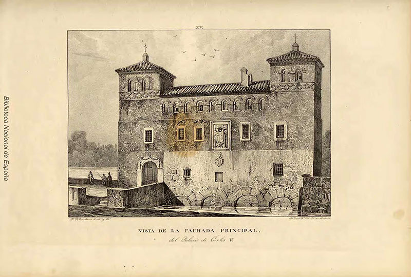 Lámina XV. Vista de la fachada principal del Palacio de Carlos V. Vista de la fachada principal del Palacio de Carlos V que da frente a este Canal, y en la parte baja del edificio se designan las cuatro bocas por las que entraba el agua del río, las que en el día están tabicadas por no hacerse uso de ese canal. En la puerta principal hay una cadena que demuestra el haberse aposentado los Reyes Nuestros Señores en este Palacio en el año de 1828.